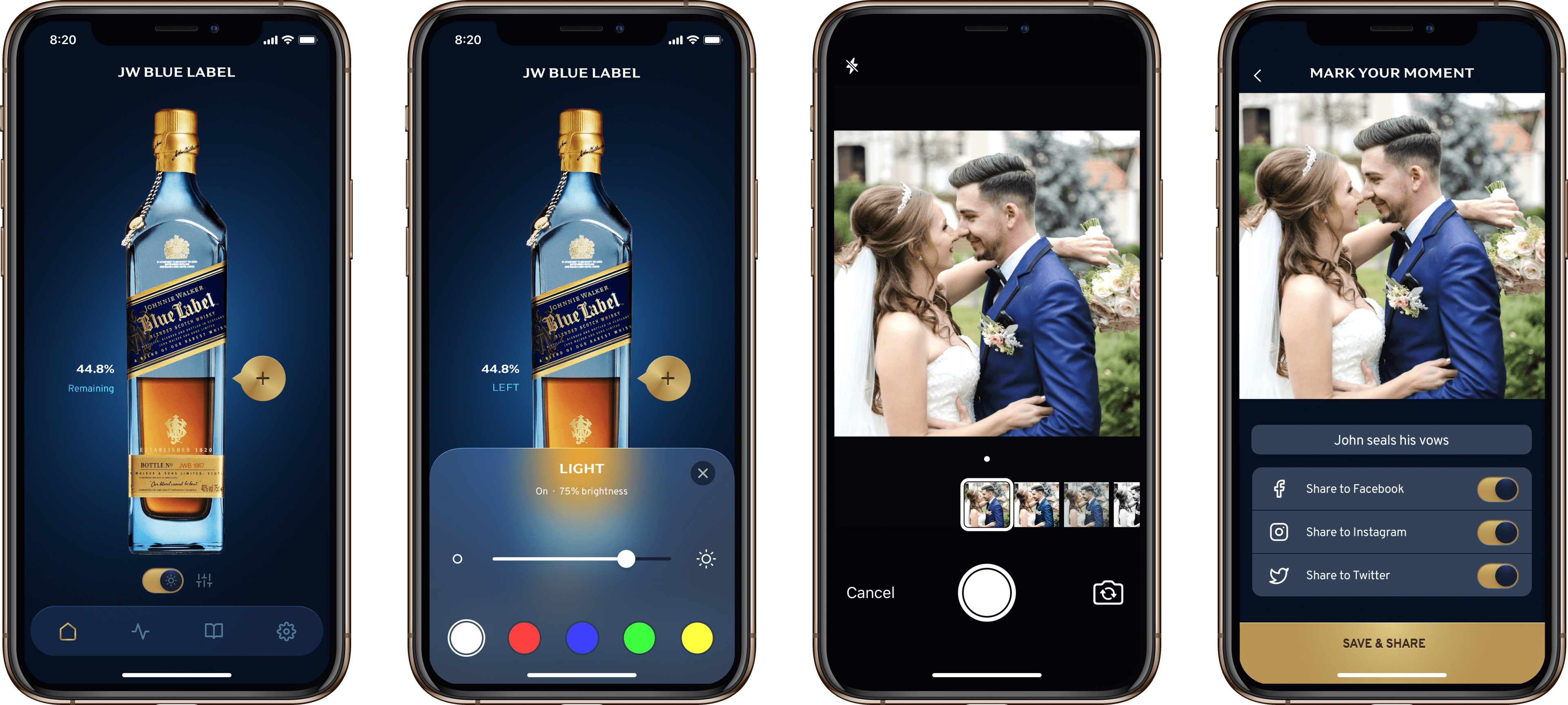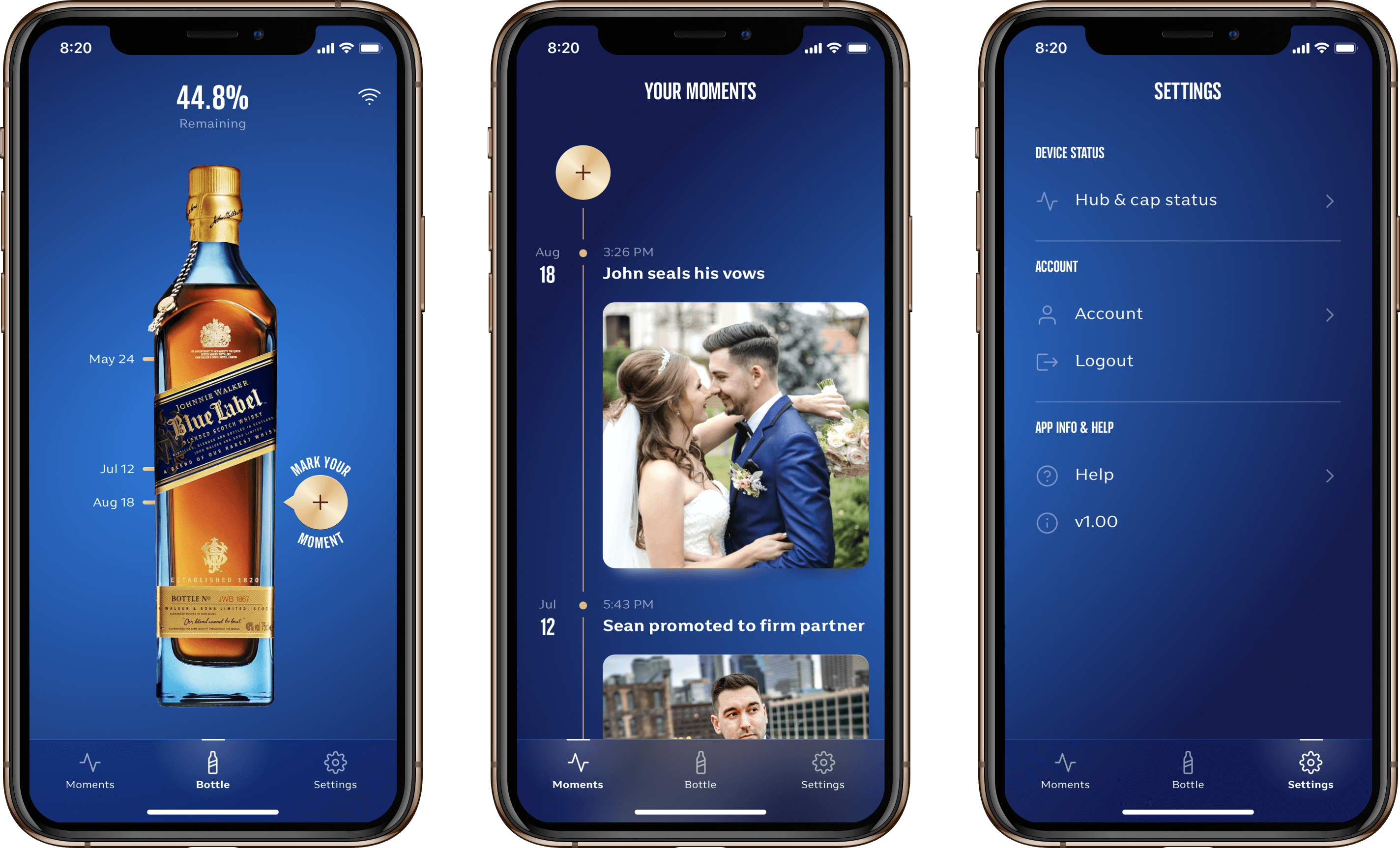 The digital version of Johnnie Walker's Mark Your Moment would use a limited edition Nectar smart cap (etched with the Johnnie Walker logo) to wirelessly track the level of a user's Blue Label bottle. The accompanying mobile app (iOS only to start) would be capable of showing the bottle level in real-time, and users would be able to "mark" their moments by snapping a photo that would be attached to the bottle level and shared to social media.